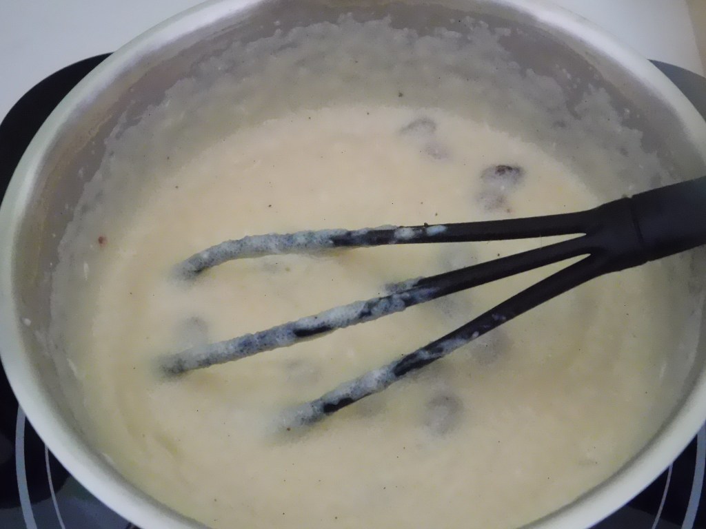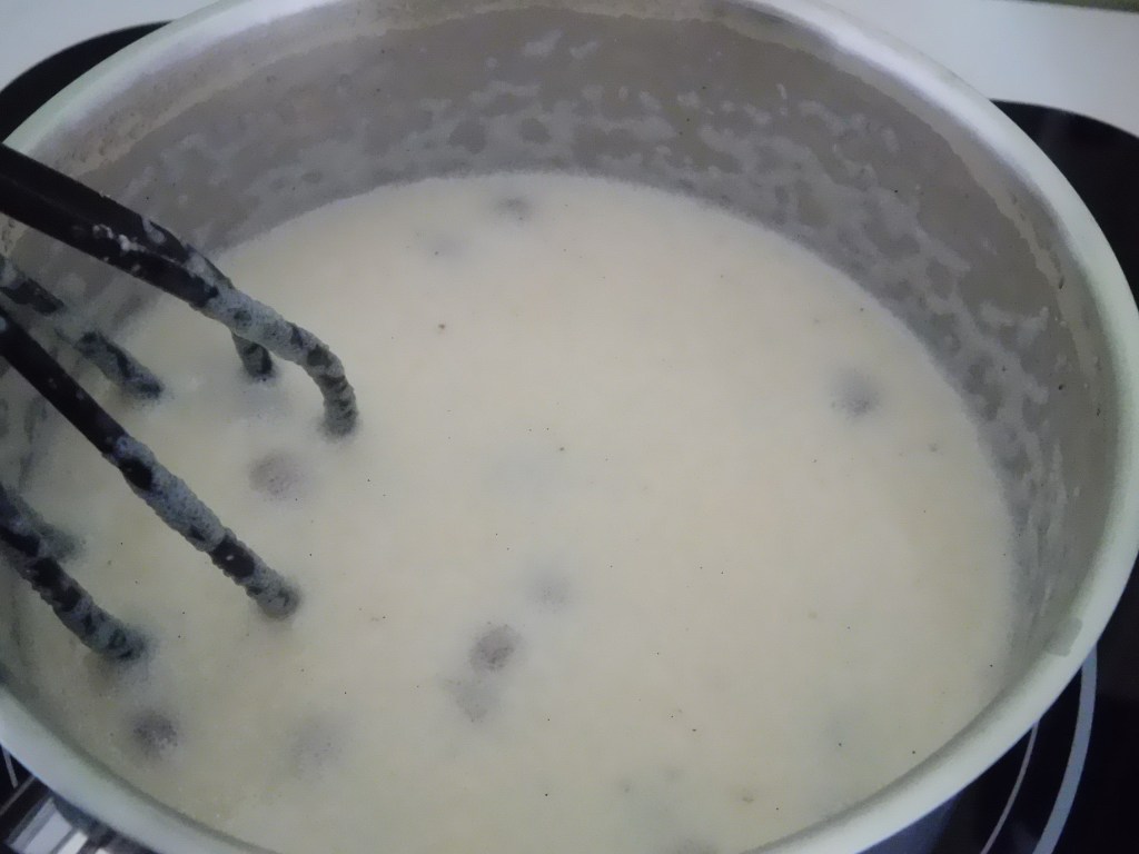 Retirez du feu , battez l’œuf en omelette et mélangez énergiquement avec la semoule .
